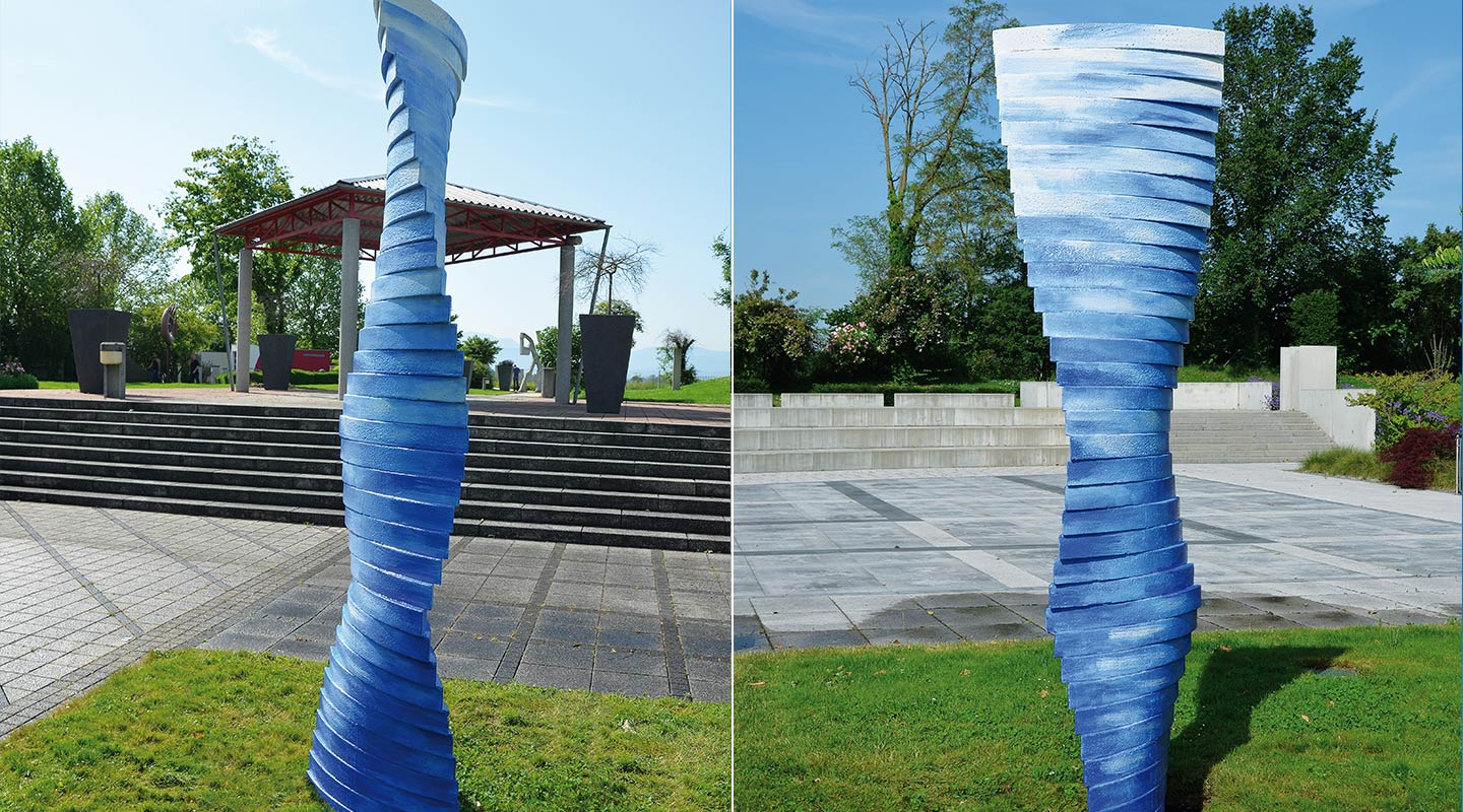 Jörg Bollin hat seiner Skulptur den Titel „Emotions“ gegeben. Bollin bringt seine Steine gerne in Kontakt mit verschiedensten Materialien, etwa mit Metall, Glas und sogar Federn. Die Arbeit mit Steinguss stellte für ihn eine besondere Herausforderung dar, war es hier ja nicht möglich, mit der gegensätzlichen Stofflichkeit unterschiedlicher Werkstoffe zu arbeiten. Ein Neuling im künstlerischen Umgang mit Beton ist er dennoch nicht, das beweist sein in Scheiben geschnittener Atlas an der Fassade des Freiburger Intercityhotels. Wenn Bollin in seinem Statement vermerkt „Die Skulptur verkörpert den Geist der Materie“, so zeigt sich, wie stark er gedanklich und emotional mit der Ausführung seiner Vorgaben verbunden ist. Aus 35 gleichförmigen, waagrecht gelagerten Einzelelementen besteht die von Bollin farbig gefasste, nahezu 3 Meter hohe Stele. In ihrer schraubenförmigen Bewegung zeigt auch sie, wie der schwere Säbel Beton zum Florett mutiert.