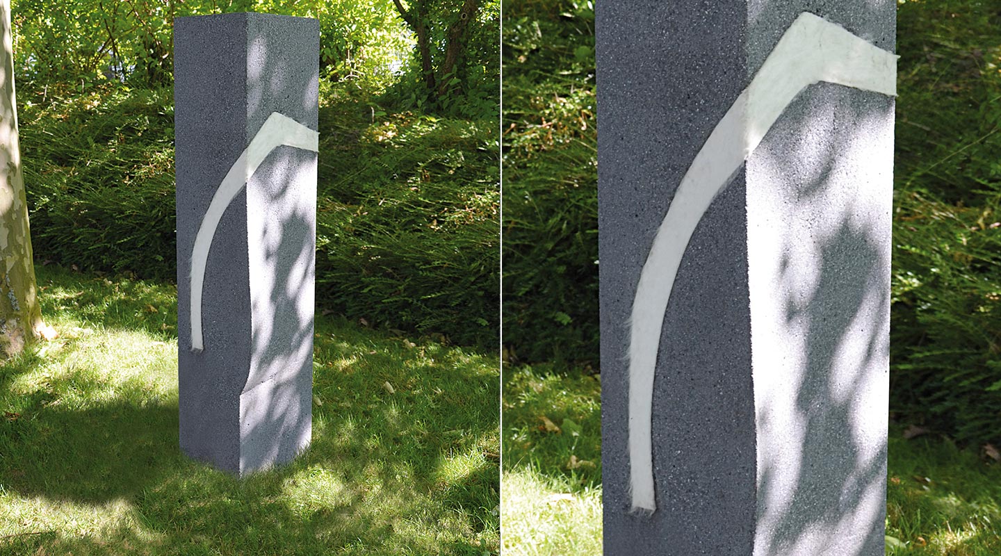 Das große Format reizt Werner Ewers aus Kehl schon lange. Er arbeitet zumeist mit den Kombinationen von Schiefer und Holz oder Schiefer und Filz. Bei seiner Komposition ">>> 2012-11>>> weiß-verbunden" aus anthrazitfarbenem Beton mit intarsienartig eingelegtem weißen Filz nutzte er die Chance und drang in ein Format vor, das sich mit Schiefer nicht hätte realisieren lassen. Ursprünglich kommt Ewers von der Malerei und Grafik, sich selbst sieht er gar nicht als typischen Bildhauer. Doch seine Suche nach einer Ausdrucksform, mit der er etwas "zutiefst Innerliches" beschreiben und in einem bewusst langsamen Prozess ausformulieren konnte, führte ihn fast zwangsläufig zur Skulptur. Das Auge lässt sich leicht täuschen, daher soll seine sanft gerundete Arbeit berührt und damit erspürt werden. In einem Punkt kommen Auge und Hand überein: Ewers ist der Meister der zarten Bewegung.