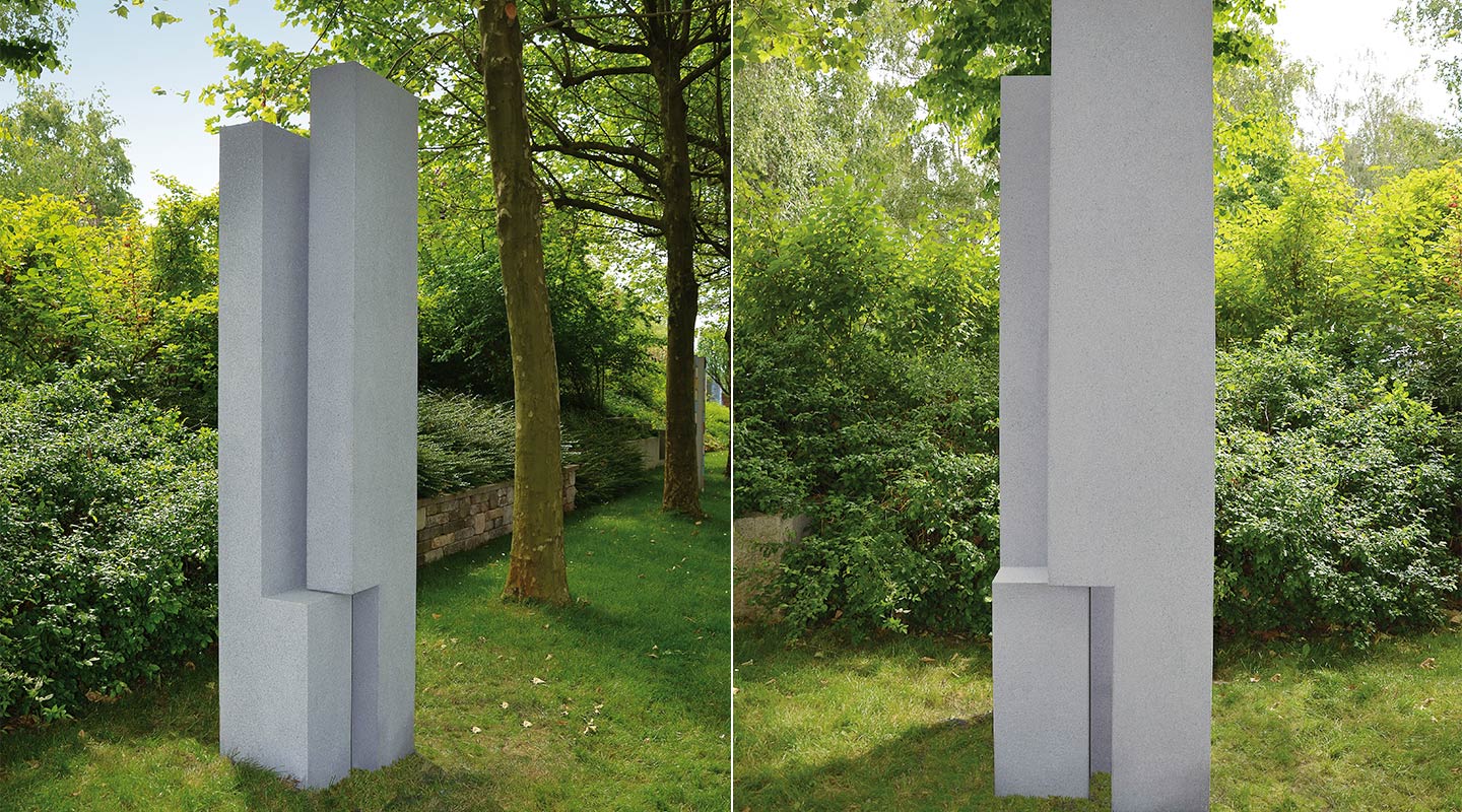 Wenn der Forchheimer Künstler Ulrich Sälzle mit Stein arbeitet, dann geht es ihm wie allen Bildhauern: Er nimmt Material weg und muss letztendlich mit dem auskommen, was (noch) vorhanden ist. Wie der Bronzeguss ermöglicht der Steinguss ein umgekehrtes Vorgehen und in seiner knapp drei Meter hohen Skulptur "im-umraum" hat Sälzle die vielfältigen Möglichkeiten von Beton als Baumaterial genutzt. Aus zwei großen, klar strukturierten Teilen wurde ein architektonisches Raumgefüge errichtet, das der baulichen und konstruktiven Anmutung des Werkstoffes mit all seiner Kargheit und Spröde entspricht. Der Titel "im-umraum" beinhaltet das Vexierspiel der Skulptur zwischen ihrem Innen- und Außenraum, sowie ihren Bezug zum Umfeld. Nicht nur die Skulptur, sondern auch ihr Standort bestimmt, ob der Betrachter sie als einen bergenden Ort des Schutzes oder als einen weit geöffneten, freisetzenden Raum wahrnimmt.